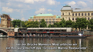 Manesuv Most. Dort sehen wir am Ufer der Altstadt ein Restaurantschiff,